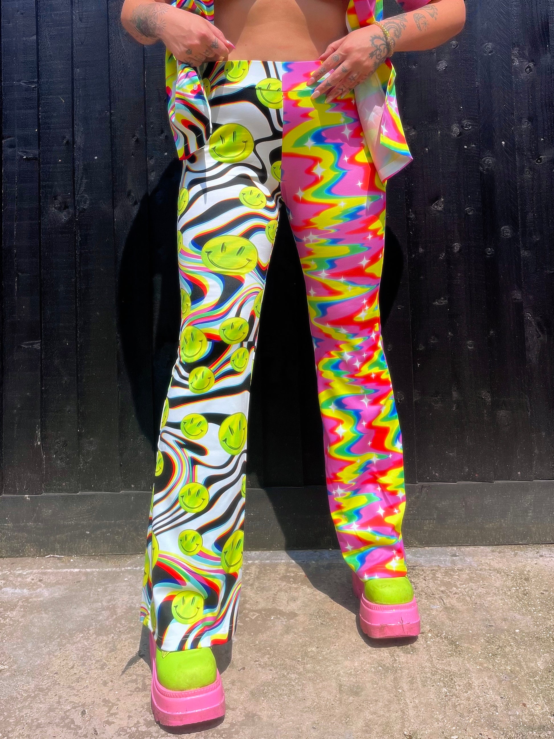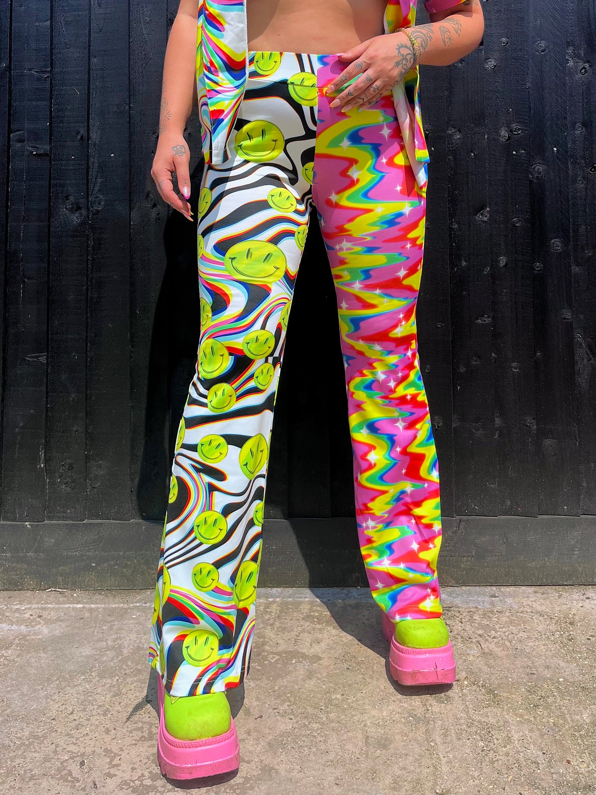 Elevate your wardrobe with these stunning high-waisted bell bottom flares, crafted from premium quality soft touch stretchy spandex. Designed for ultimate comfort and style, these flares feature a bold and vibrant print that’s sure to turn heads. The high-stretch fabric provides a flattering fit and maximum comfort, making them perfect for all-day wear. Whether you're rocking them for everyday errands or showcasing your festival spirit at raves and events, these flares are effortlessly chic and versatile. Step out in style and embrace the perfect blend of comfort and flair with these must-have bell bottoms!