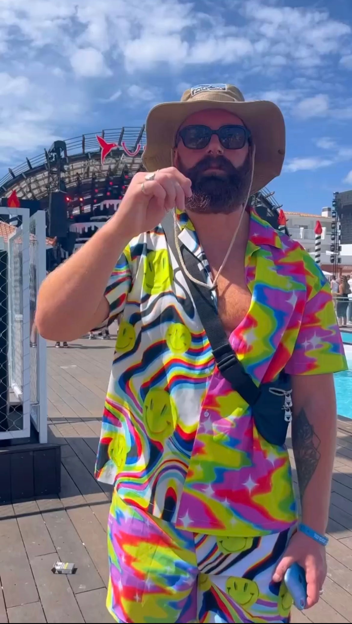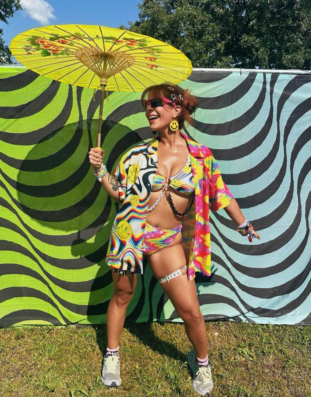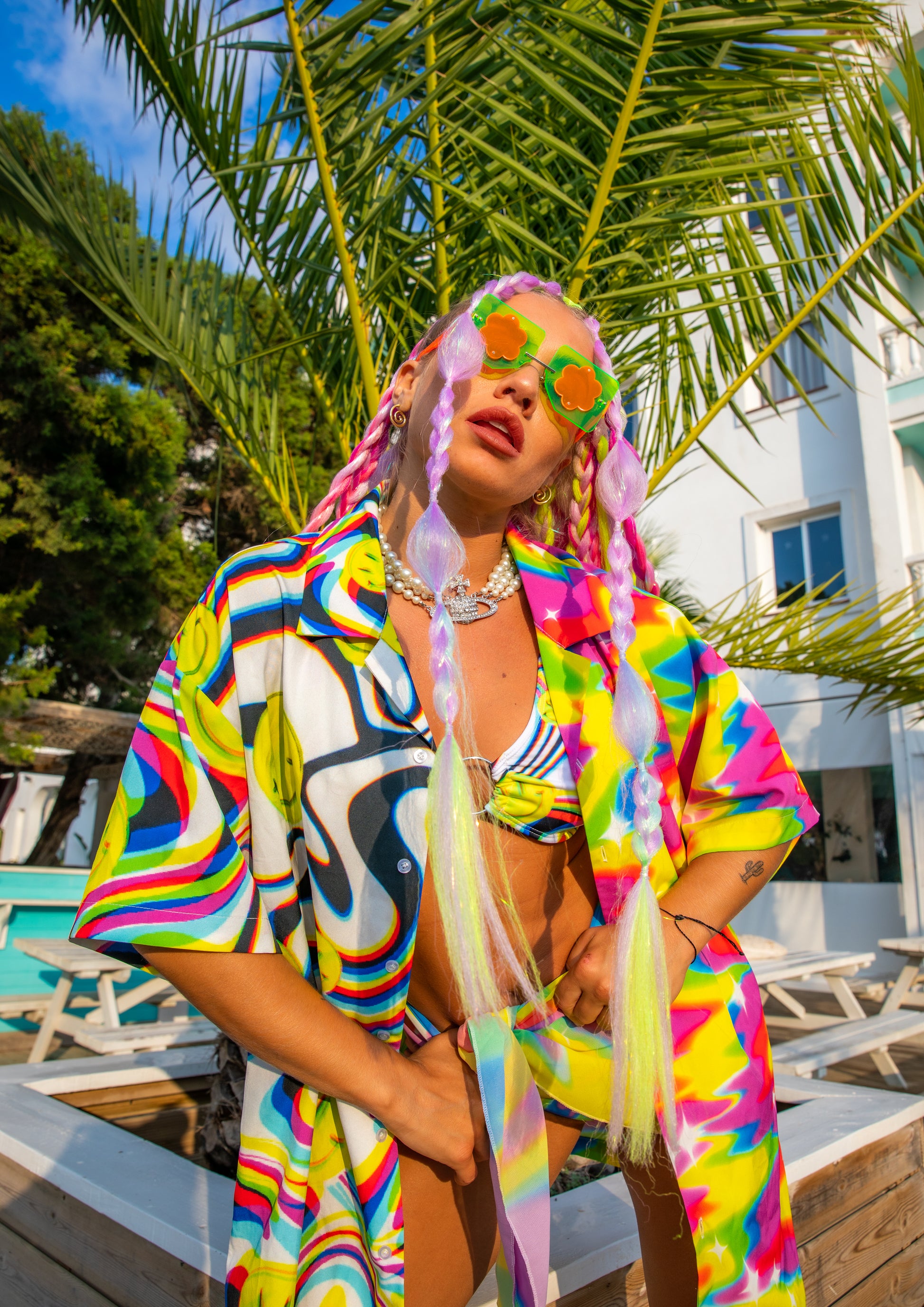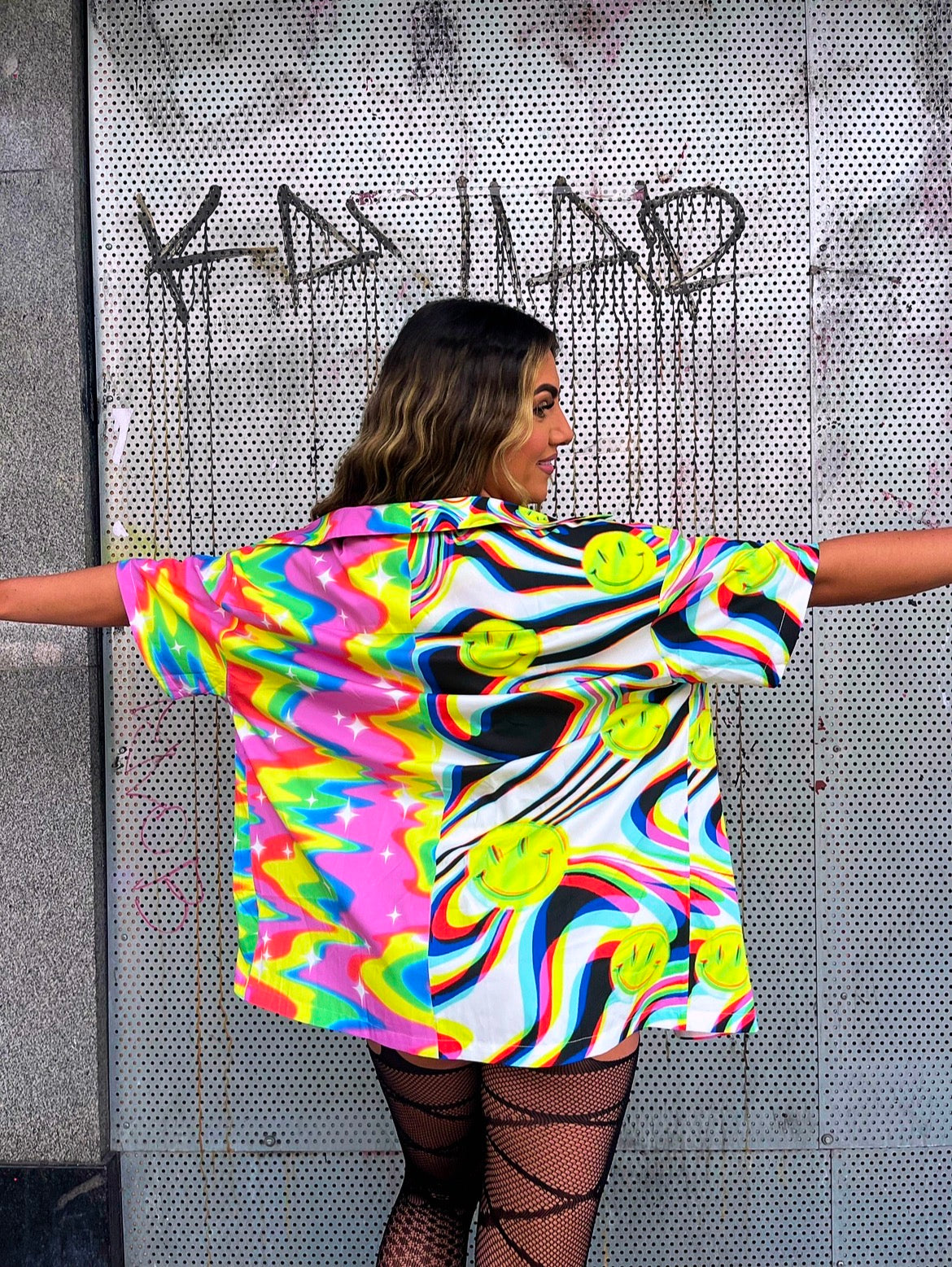 Stand out from the crowd in this y2k rainbow graphic print button up shirt