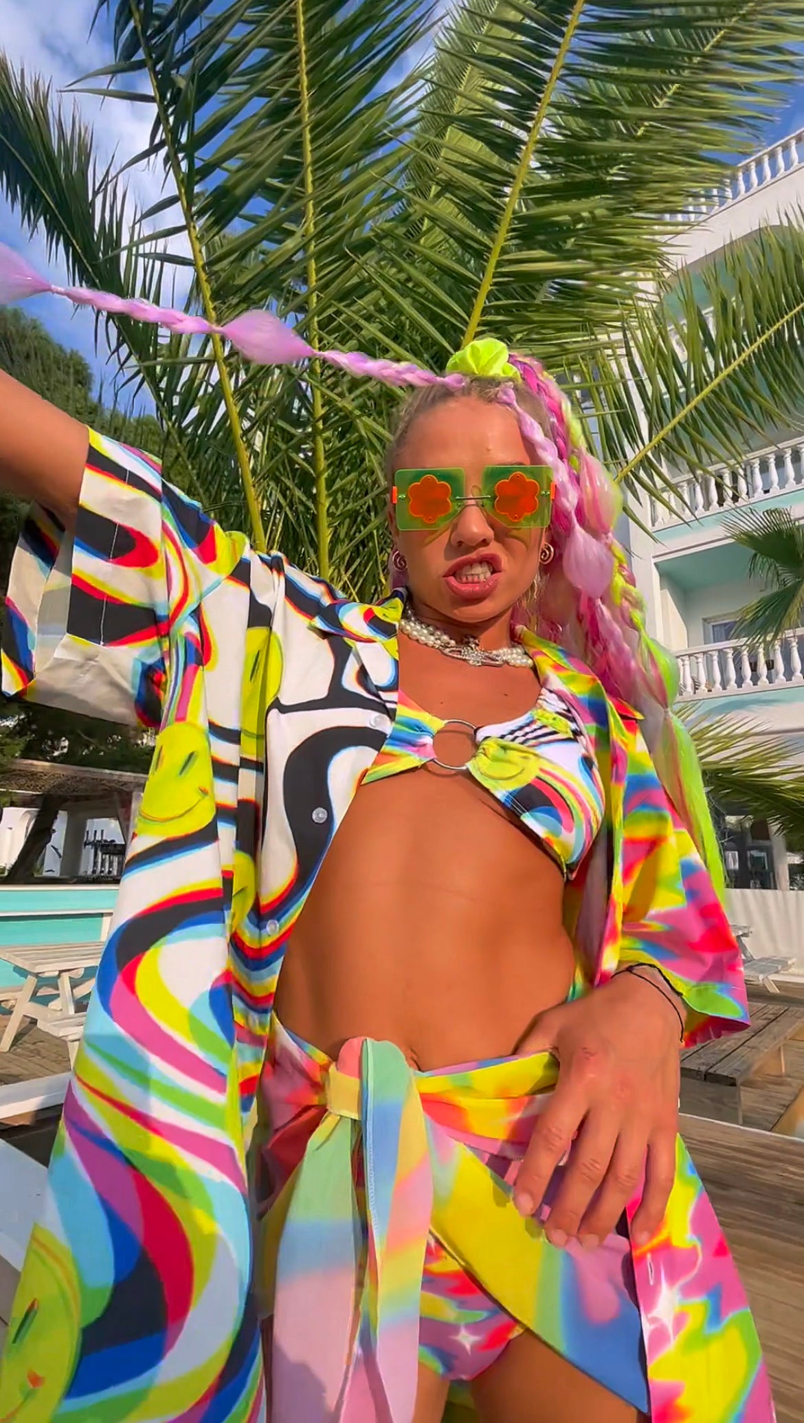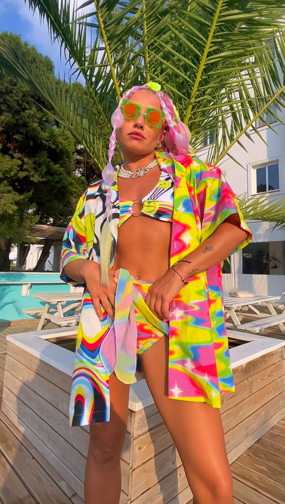 Stay sassy in this fun printed Hawaiian style short sleeve button down shirt. The lightweight, floaty fabric will keep you cool and comfortable. Perfectly paired with our Spoiled Brat bikini set