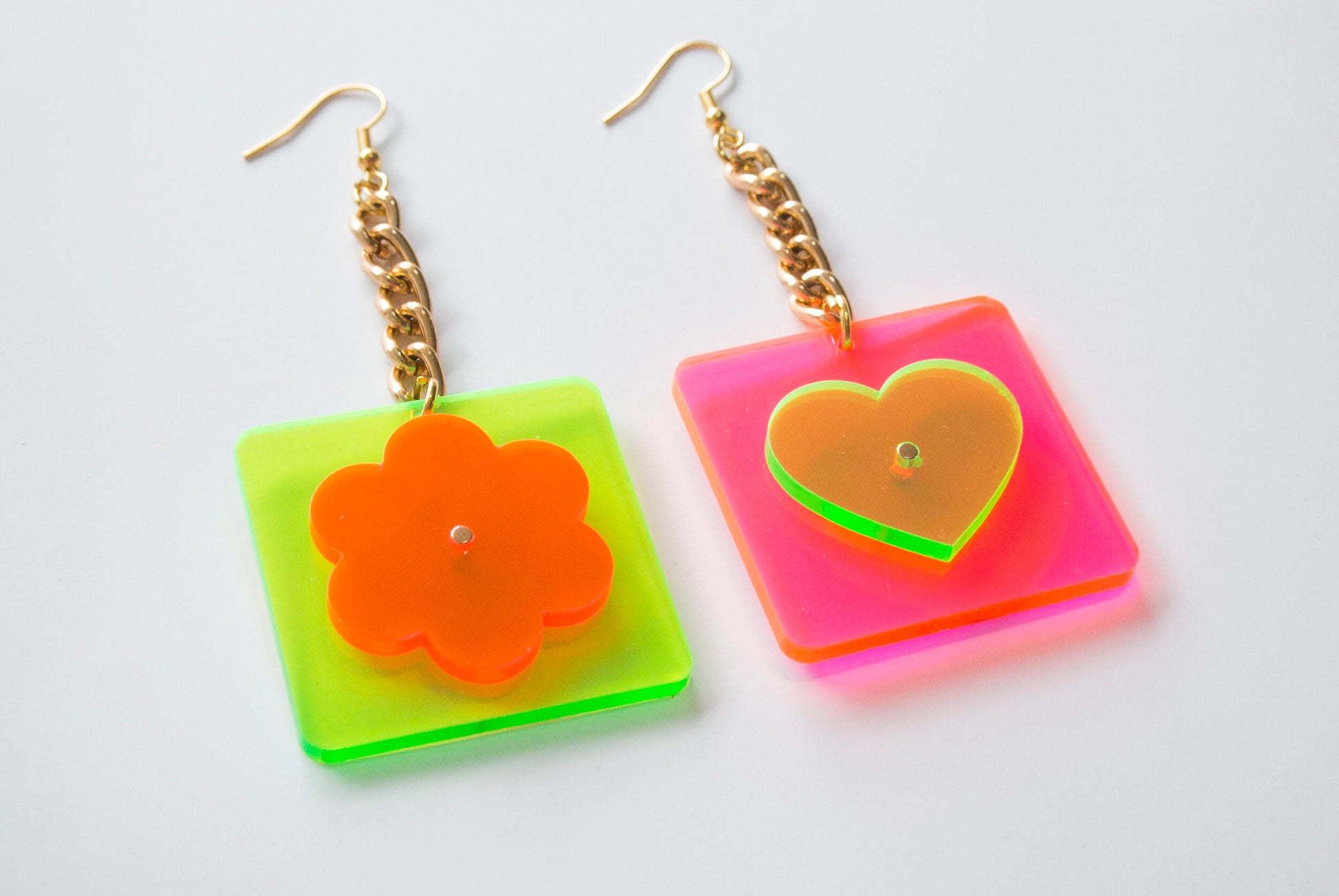 Earrings come in contrasting colours as seen in the pictures - one heart design, one flower design!