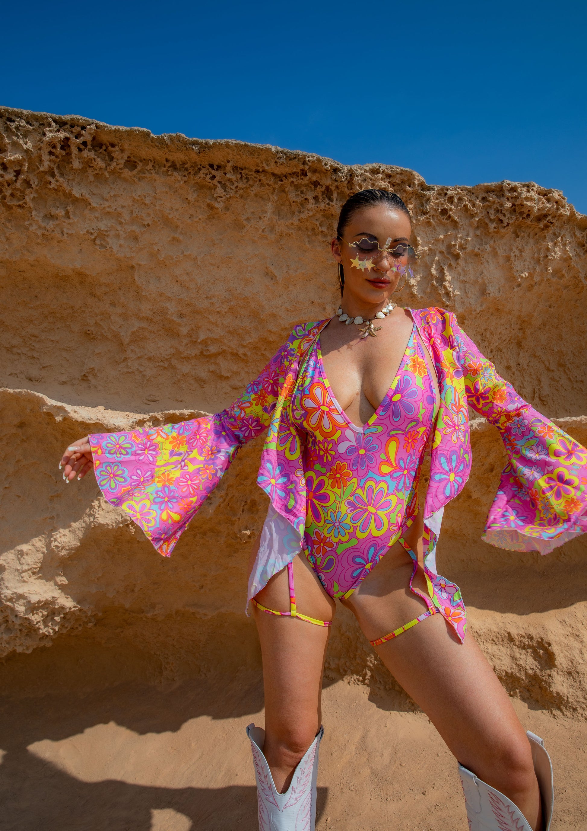Made for cosmic queens and bold souls — the Trippy Drip Garter One-Piece is swimwear with serious attitude. Featuring our signature Trippy Drip print packed with rainbow swirls and smiley faces, this psychedelic suit is pure dopamine dressing. The plunging neckline can be styled your way — classic or criss-crossed — while the high-cut legs and cheeky fit keep things fiery. And the finishing touch? Strappy built-in leg garters that take you from beachside to the main stage in head-turning style.