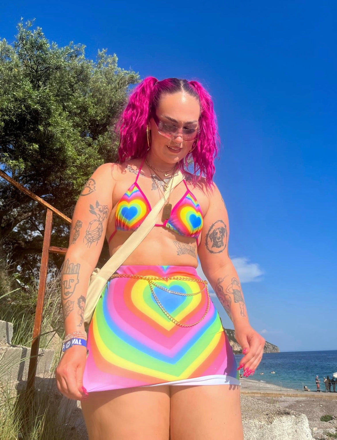 Stay sassy with this fun rainbow love heart print triangle bikini top 💖🌈