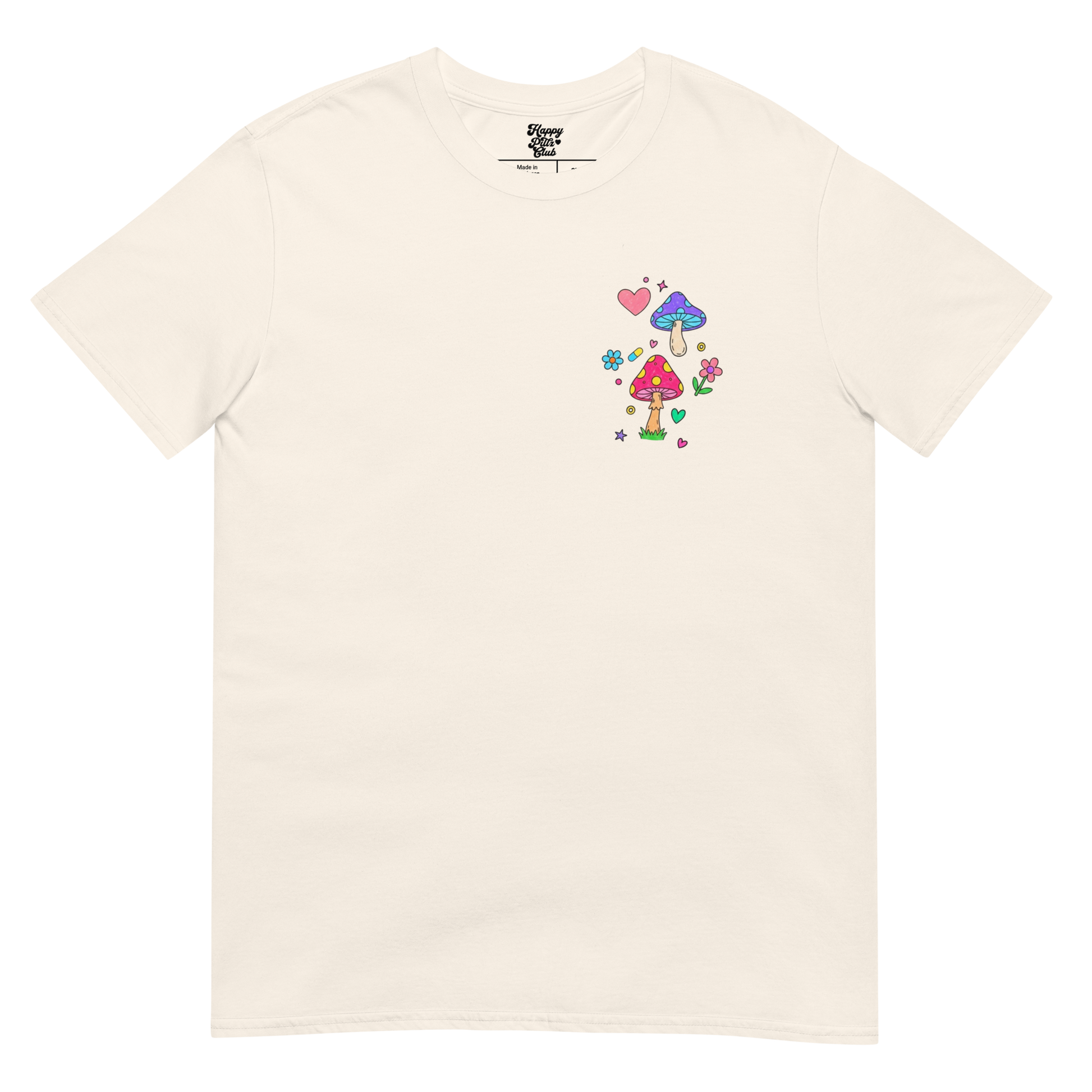 Our cream (Magic) Mushroom tee features a small mushroom logo on the front and a bold, playful graphic on the back