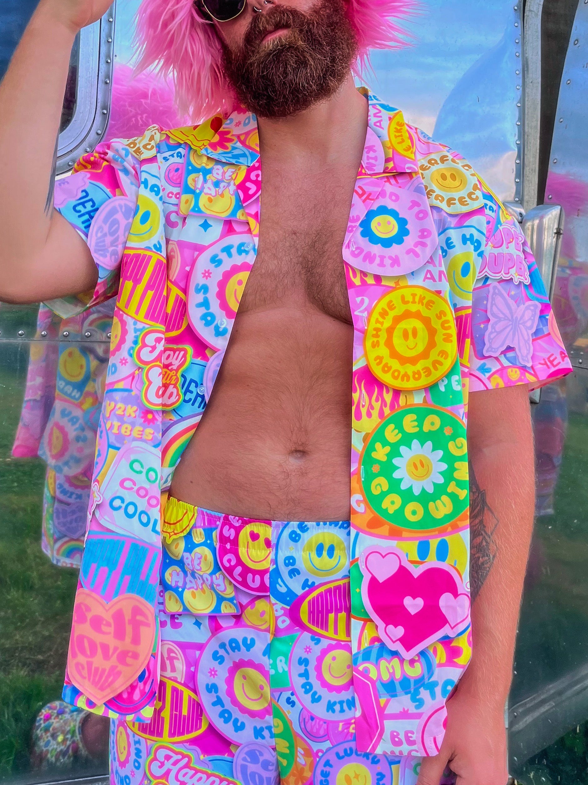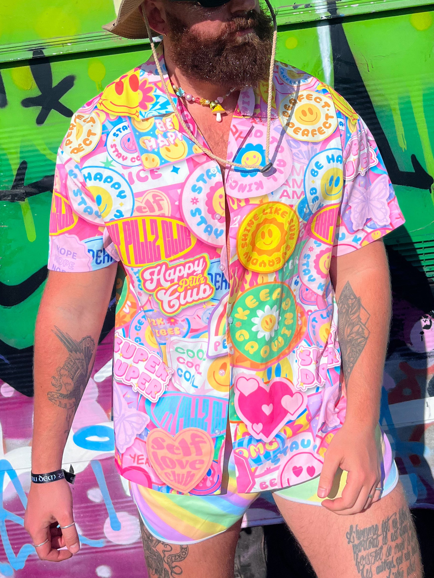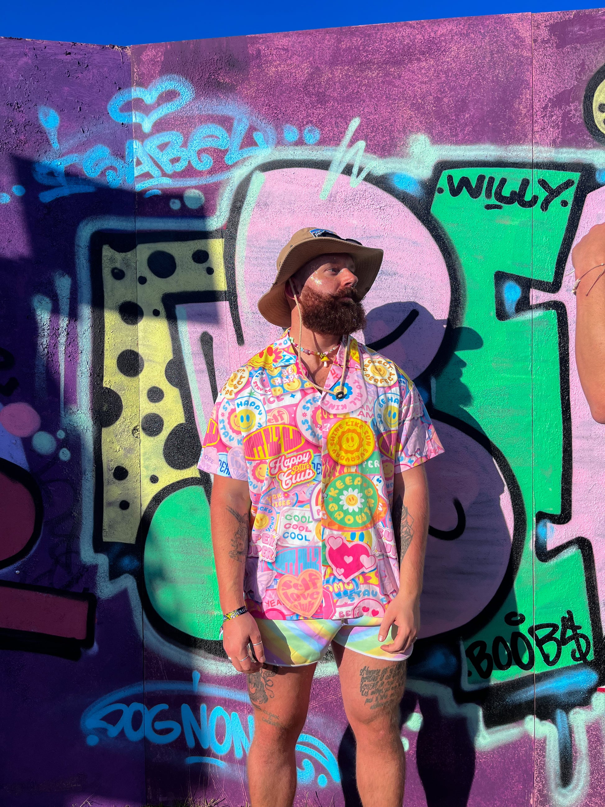 Stand out from the crowd in this y2k rainbow graphic print button up shirt