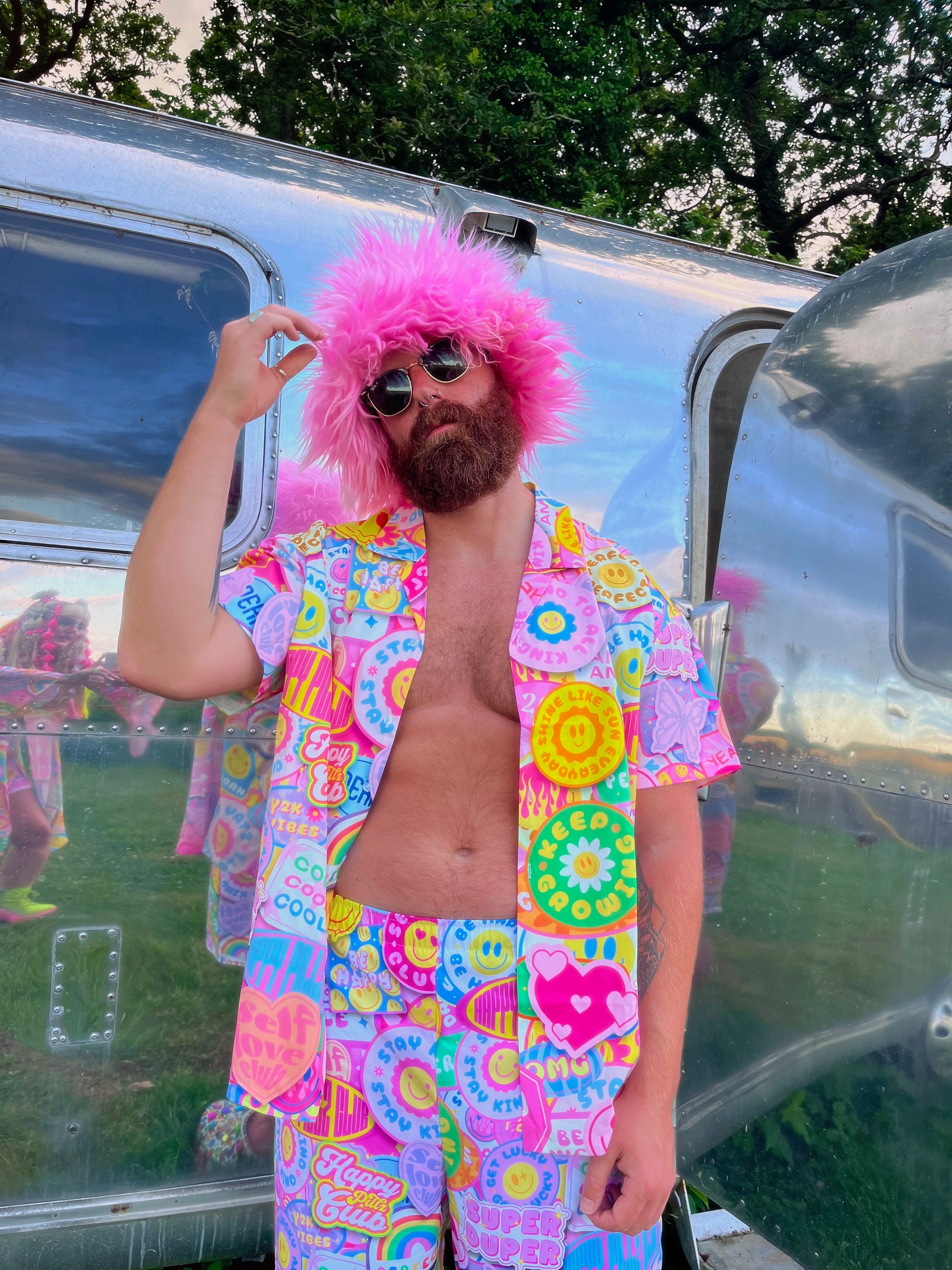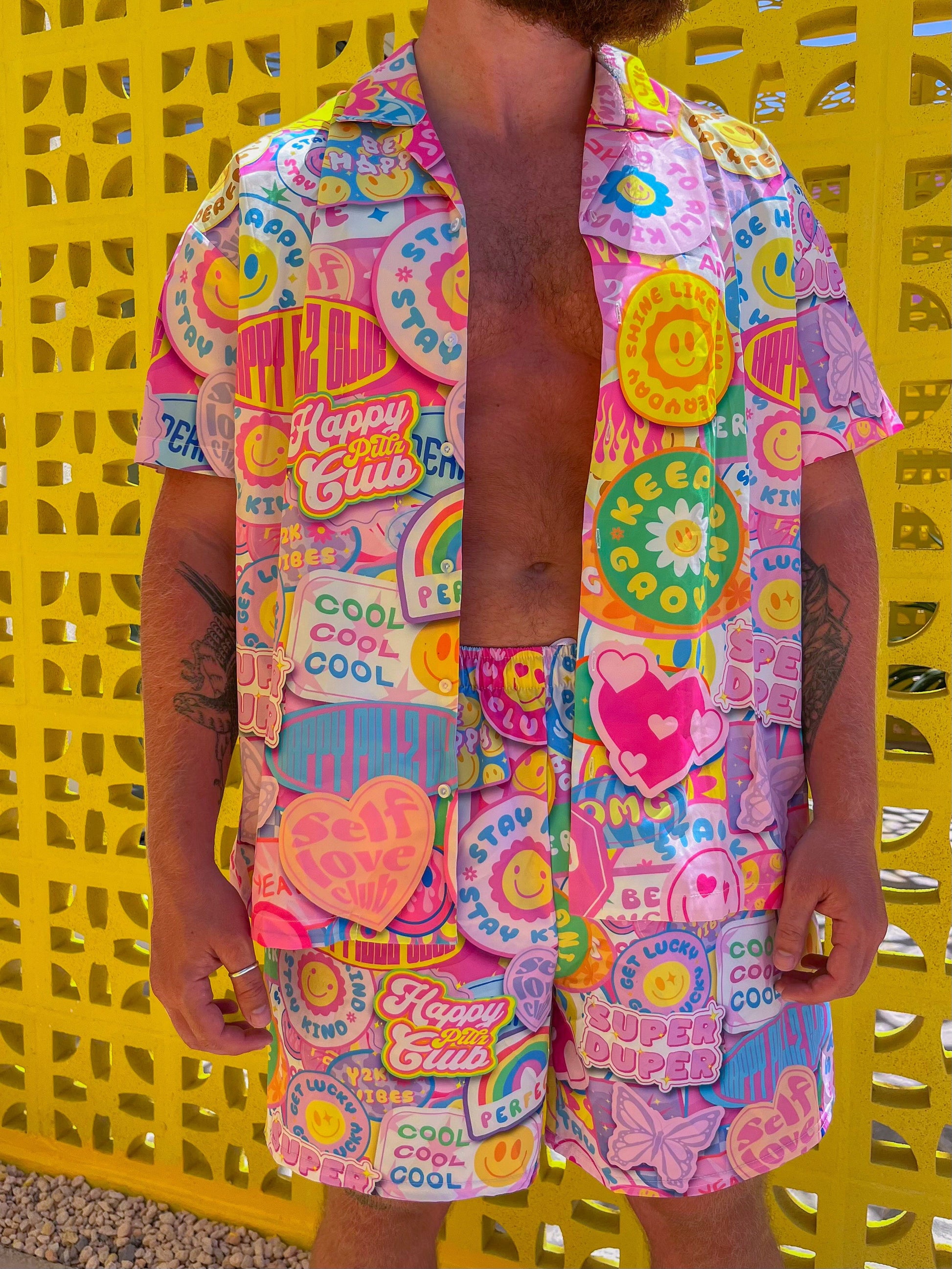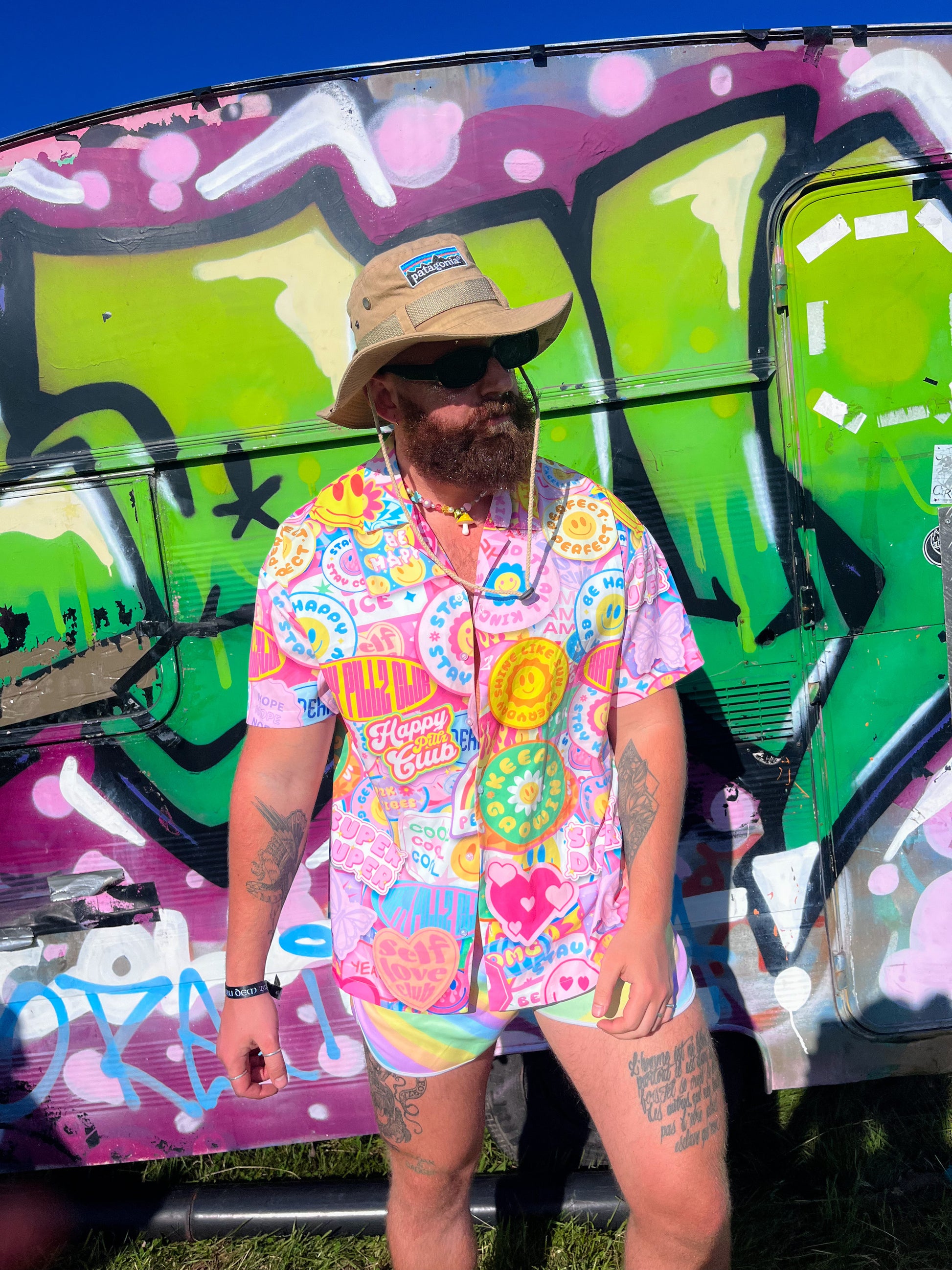 Stand out from the crowd in this y2k rainbow graphic print button up shirt
