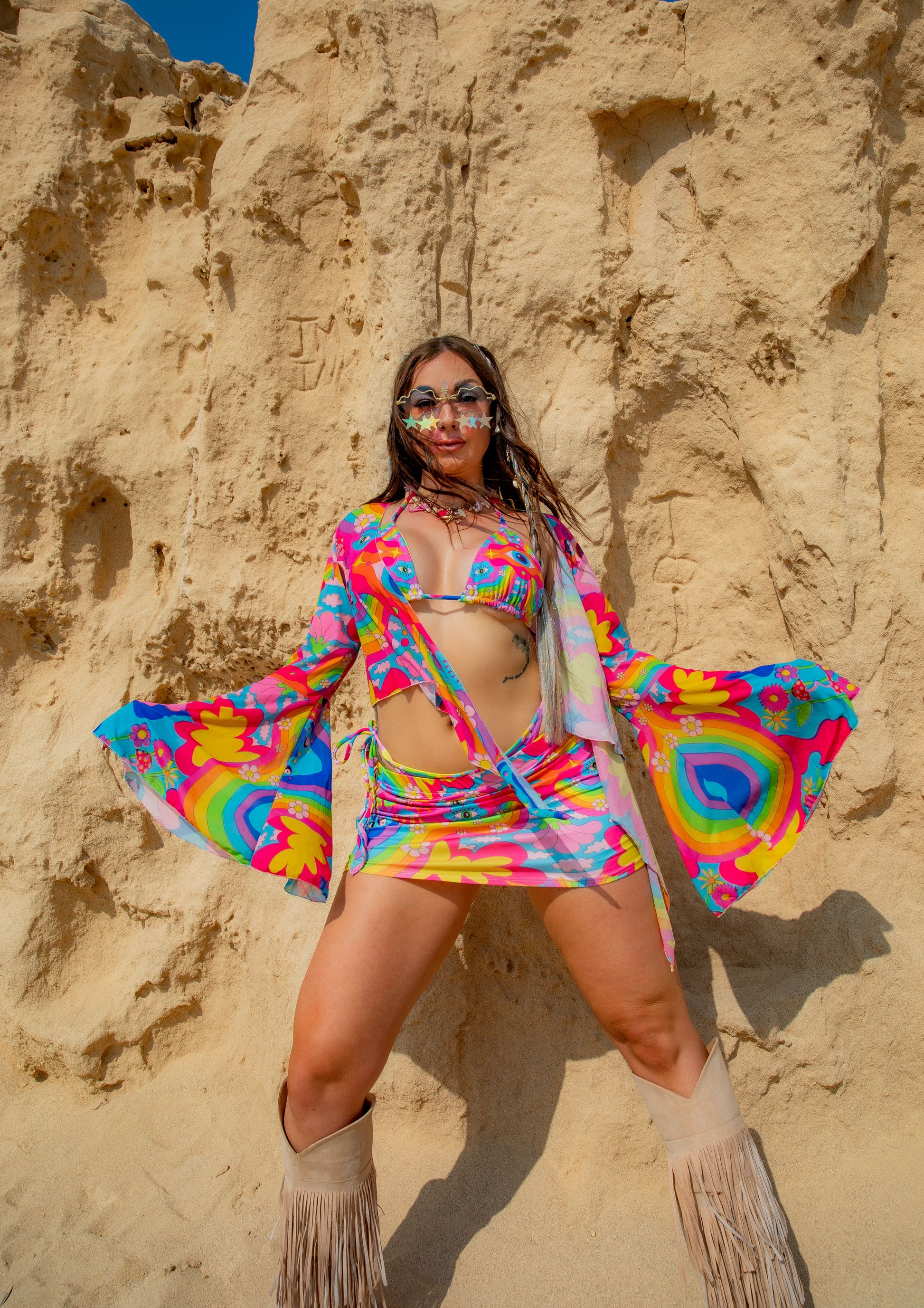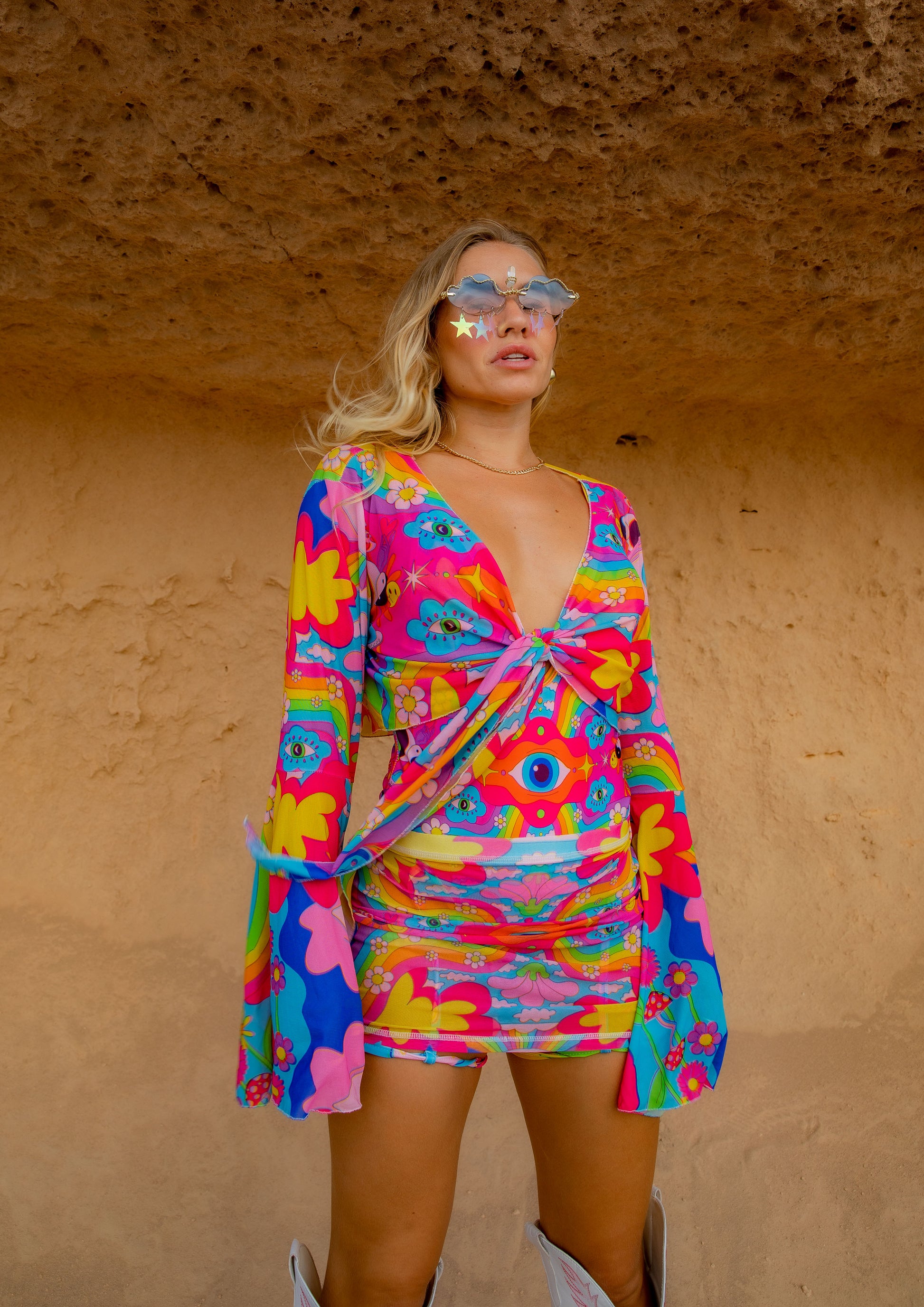 Cosmic Gaze Mesh Bell Sleeve Cropped Tie Top