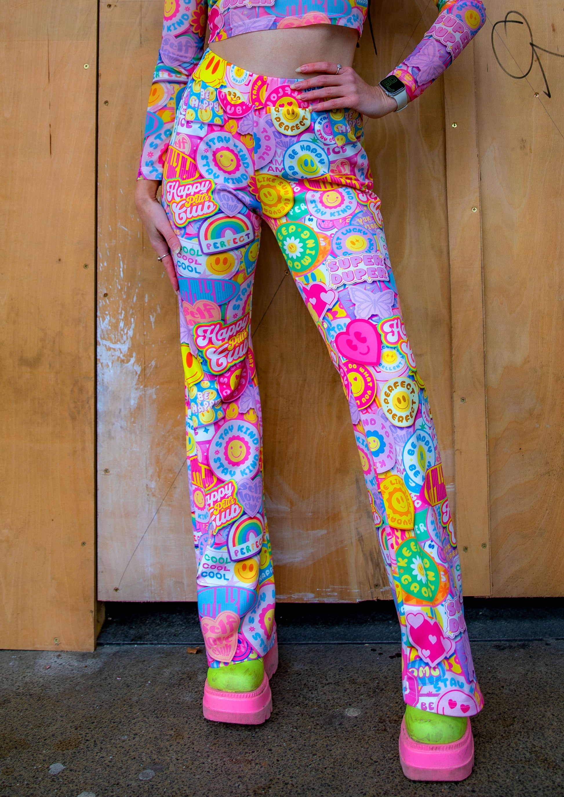 Elevate your wardrobe with these stunning high-waisted bell bottom flares, crafted from premium quality soft touch stretchy spandex. Designed for ultimate comfort and style, these flares feature a bold and vibrant print that’s sure to turn heads. The high-stretch fabric provides a flattering fit and maximum comfort, making them perfect for all-day wear. Whether you're rocking them for everyday errands or showcasing your festival spirit at raves and events, these flares are effortlessly chic and versatile. Step out in style and embrace the perfect blend of comfort and flair with these must-have bell bottoms!