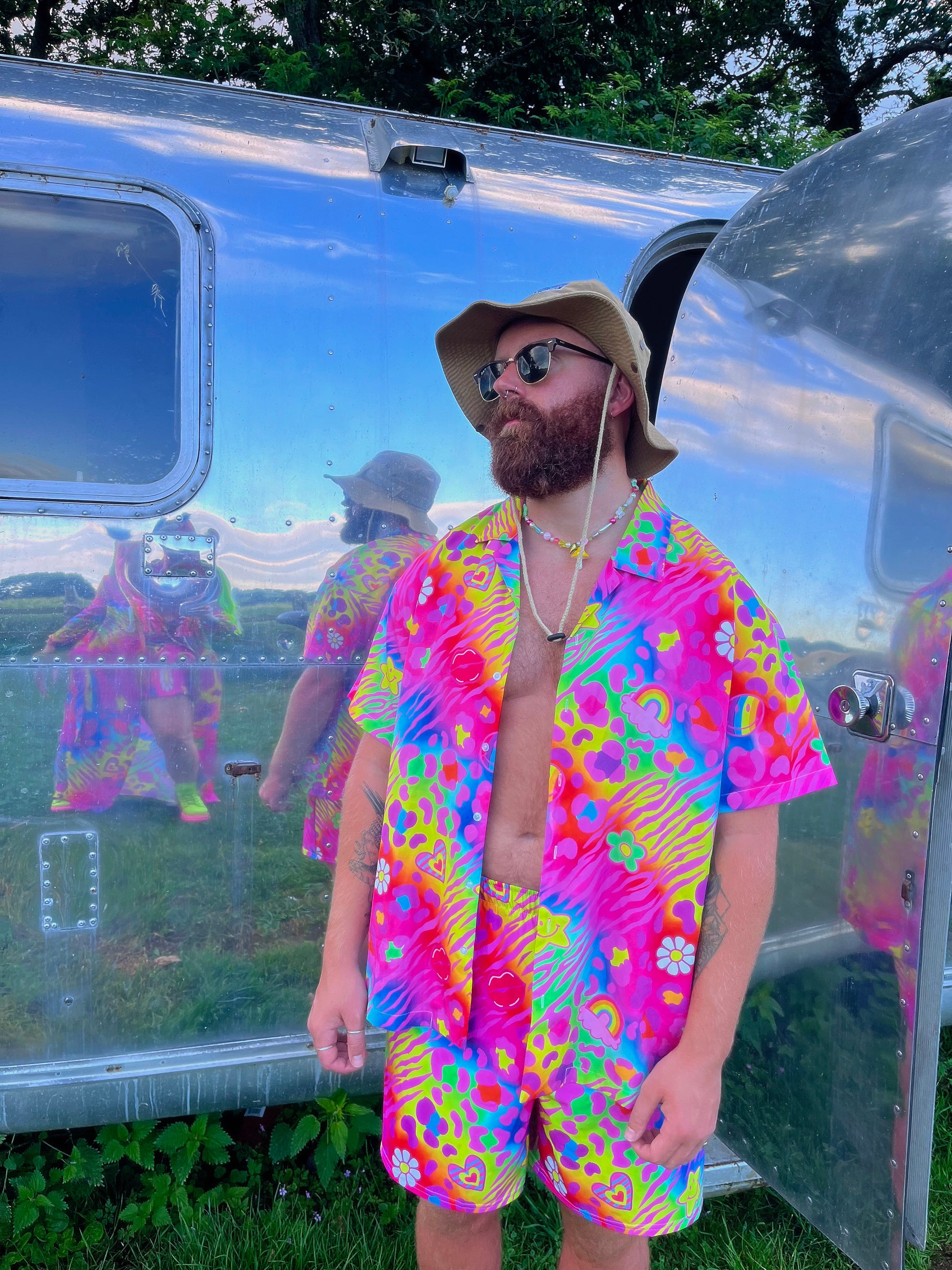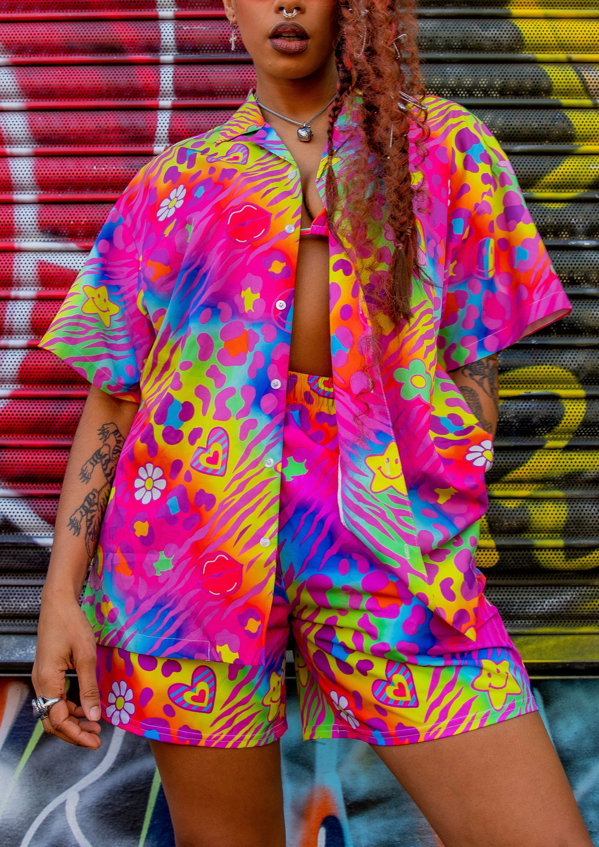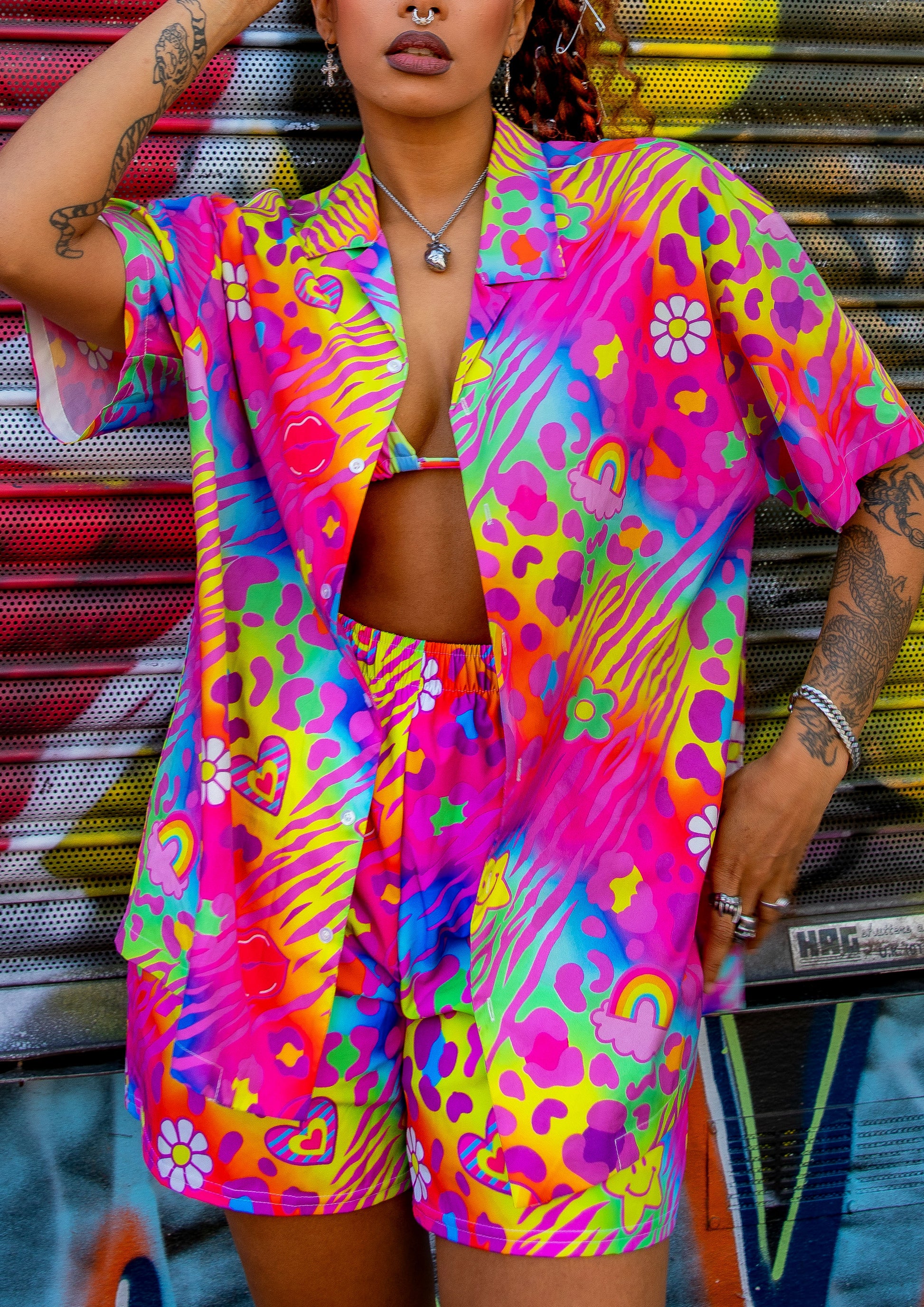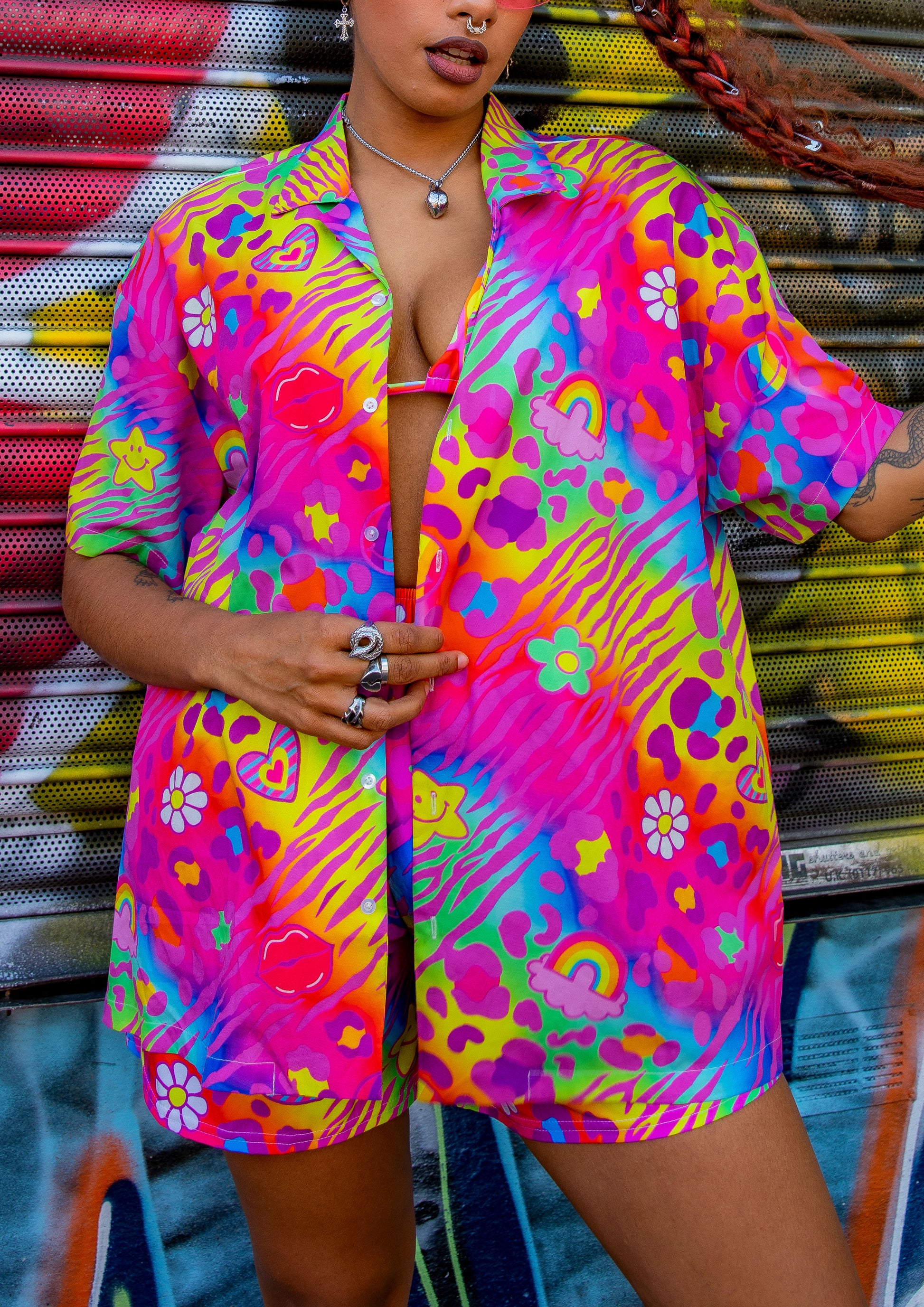 Stand out from the crowd in this y2k rainbow graphic print button up shirt